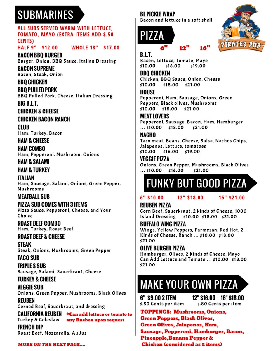 Welcome to Pirate's Pub, a charming establishment located at 117 W Main St, Westphalia, MI, where you'll find a delightful menu designed to satisfy every appetite. This cozy pub specializes in made-to-order pizzas, with delightful combinations spanning from plain cheese to a variety of toppings, all at affordable prices.